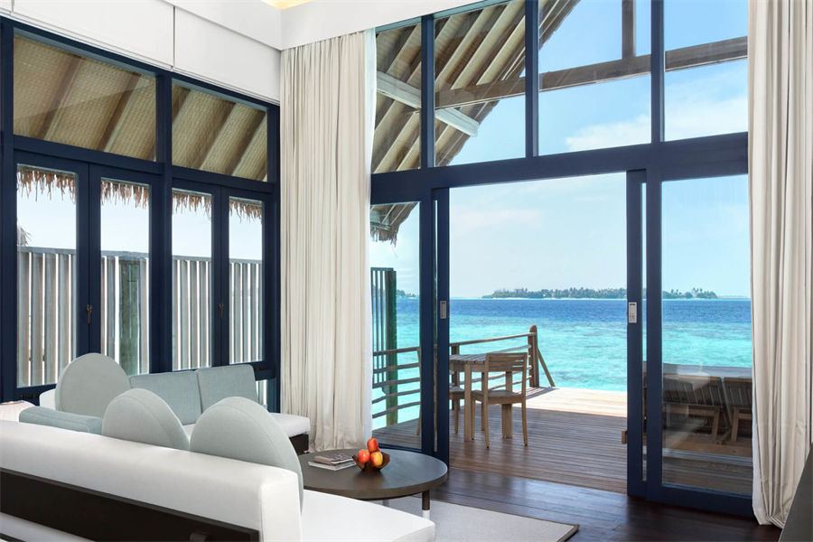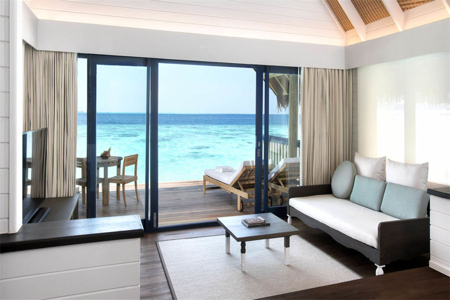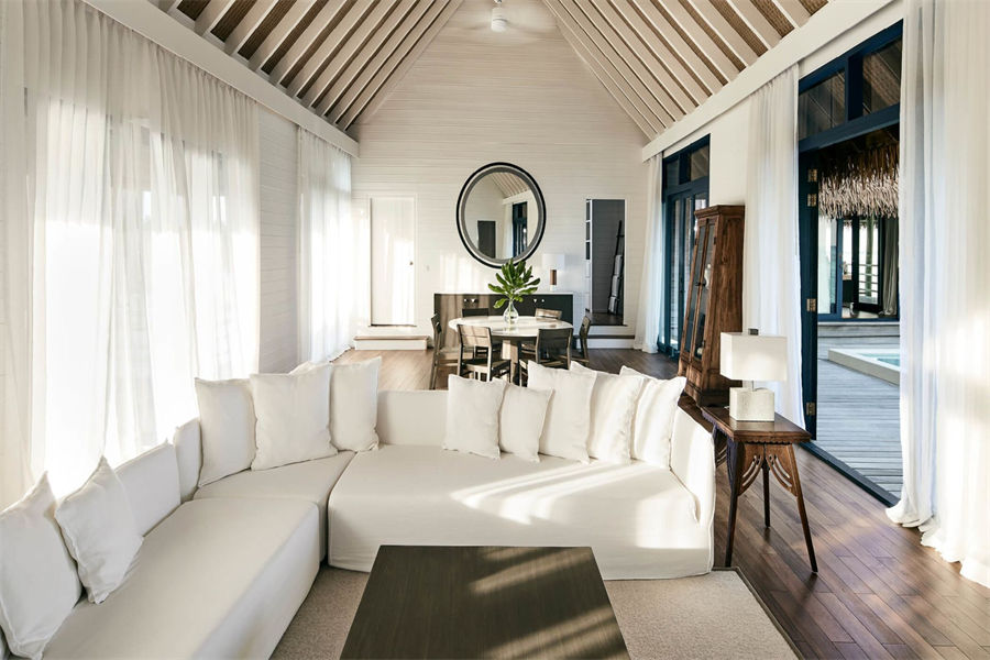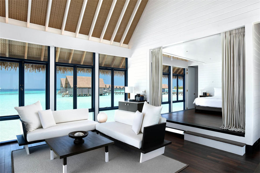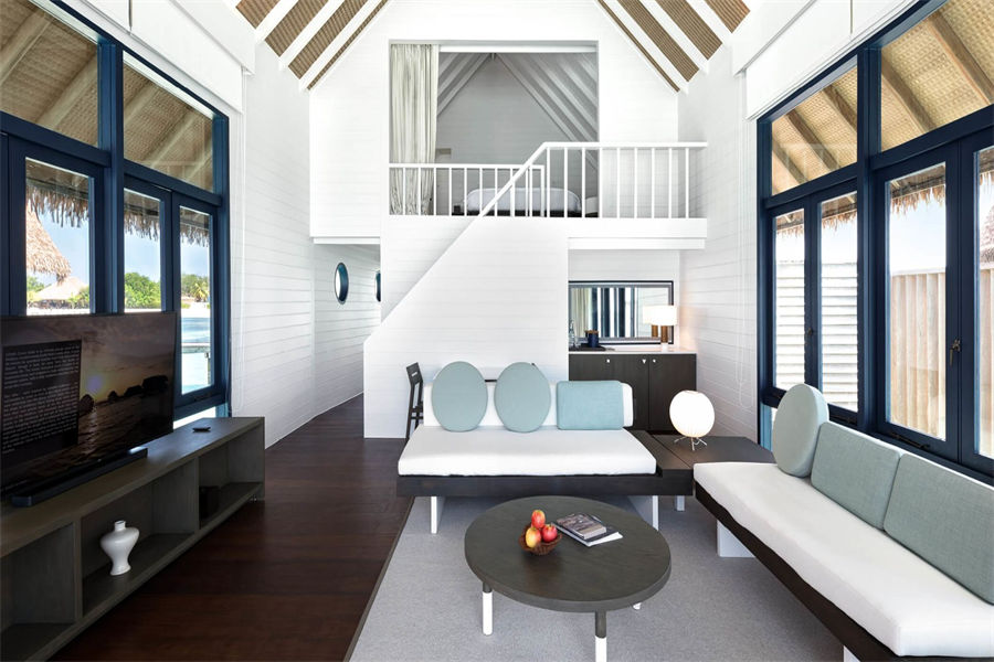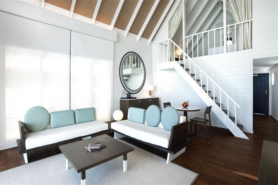 房型介绍:在复式水上别墅中,您可以在您的私人日光浴露台远眺,远处的地平线仿佛无边无际,如果您在落地窗前往外看,海洋似乎就在您的窗前澎湃。高层阁楼是一间带浴室的主卧室,首层露台设有宽敞通风的起居区,可兼作入住家庭的睡眠空间。别墅还配有隐秘的室外淋浴,其台阶可直达大海。