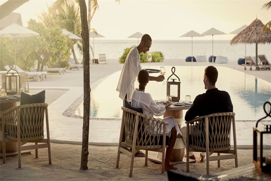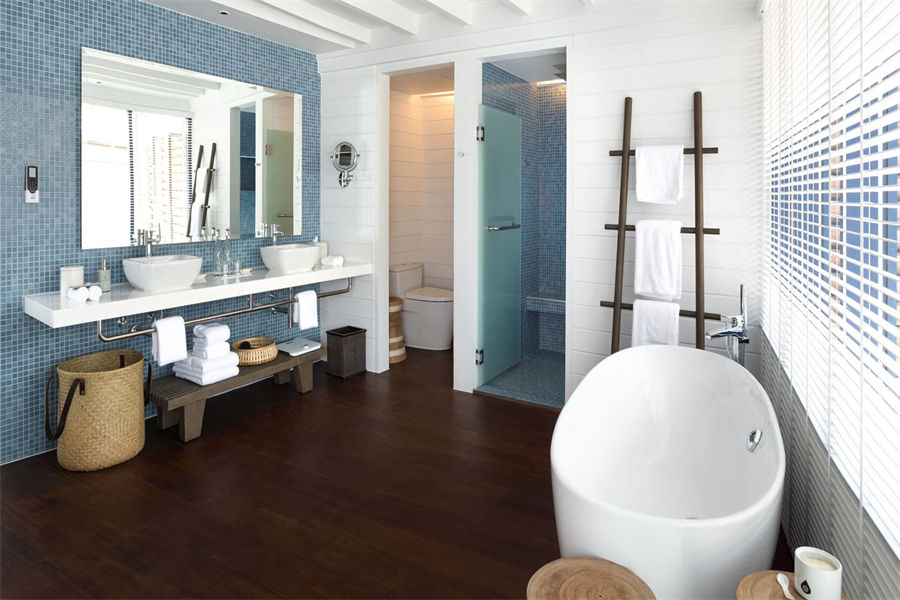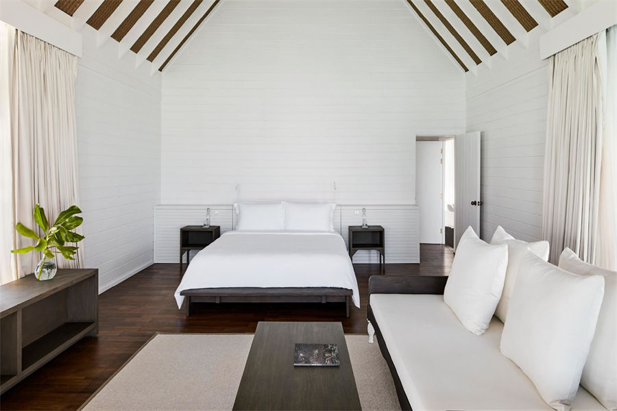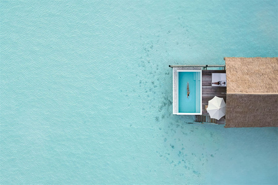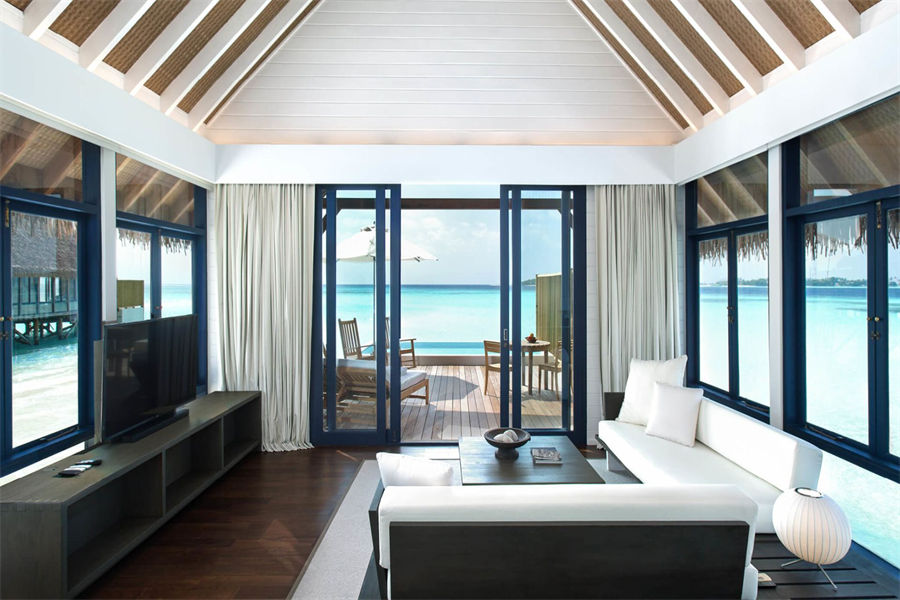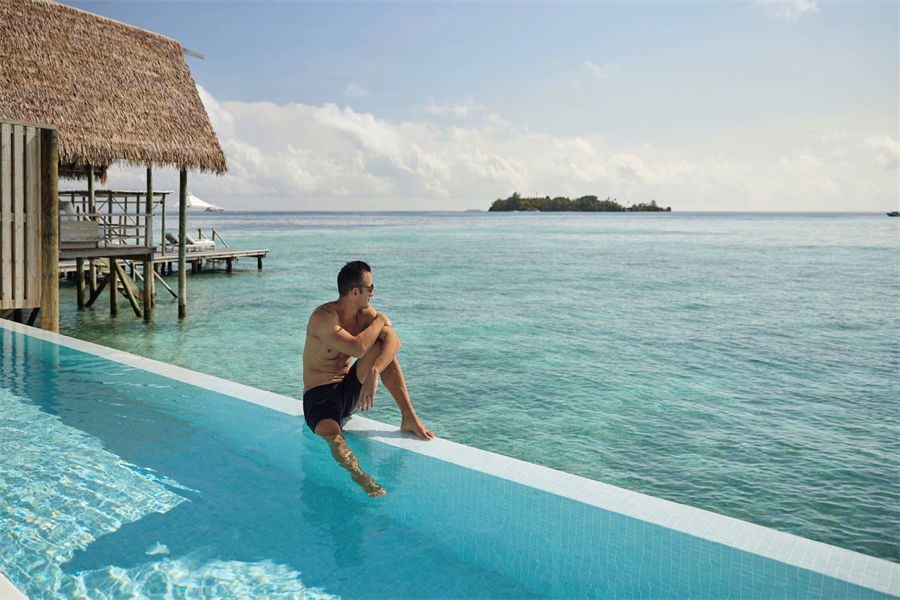 房型介绍:在复式水上别墅中,您可以在您的私人日光浴露台远眺,远处的地平线仿佛无边无际,如果您在落地窗前往外看,海洋似乎就在您的窗前澎湃。高层阁楼是一间带浴室的主卧室,首层露台设有宽敞通风的起居区,可兼作入住家庭的睡眠空间。别墅还配有隐秘的室外淋浴,其台阶可直达大海。